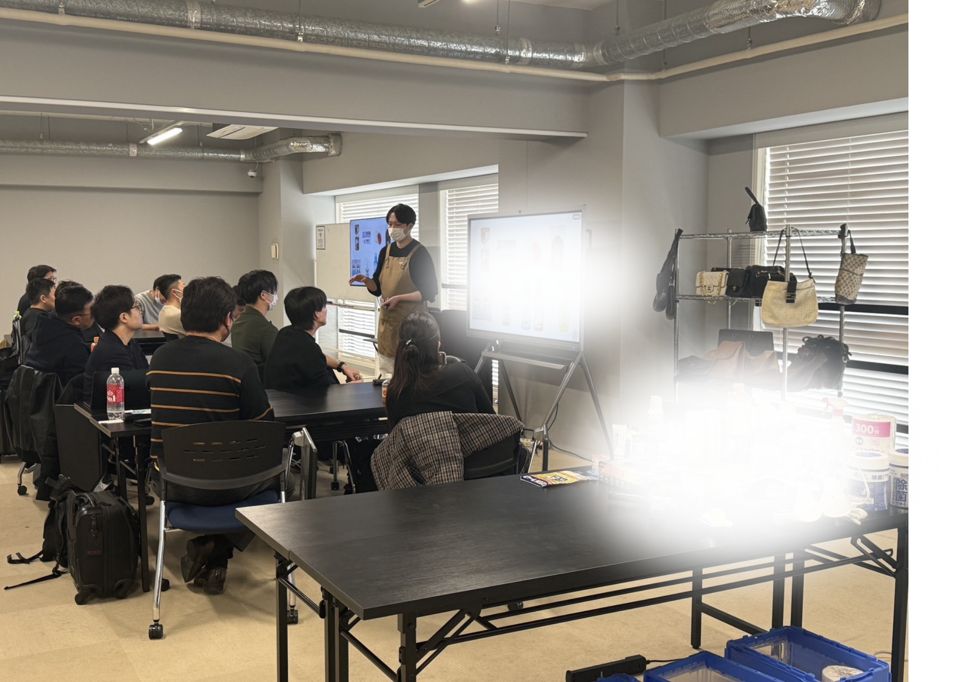 まずは座学からスタート。 ブランドバッグに使われる多種多様なレザーの特性や、リペアに使用する溶剤の化学的な知識を深めました。